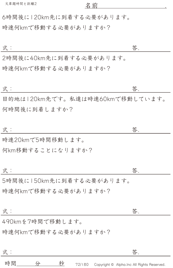 上記のボタンから「時間と距離の文章題2:時速80kmまで・10km単位」の算数数学ドリル・計算ドリル(PDFプリント)がダウンロードできます。個人利用は無料です(家庭以外での配布は有料です)。