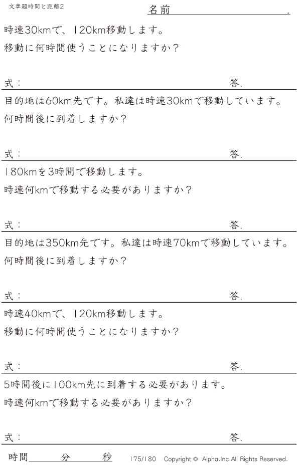 上記のボタンから「時間と距離の文章題2:時速80kmまで・10km単位」の算数数学ドリル・計算ドリル(PDFプリント)がダウンロードできます。個人利用は無料です(家庭以外での配布は有料です)。