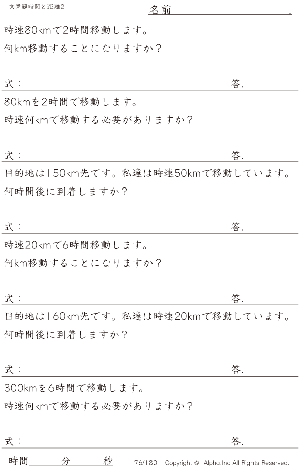 上記のボタンから「時間と距離の文章題2:時速80kmまで・10km単位」の算数数学ドリル・計算ドリル(PDFプリント)がダウンロードできます。個人利用は無料です(家庭以外での配布は有料です)。