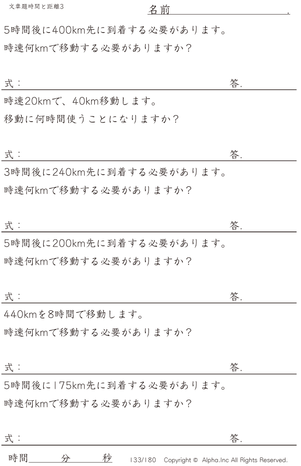 時間と距離の文章題3:時速120kmまで・5km単位 [問題]133/180