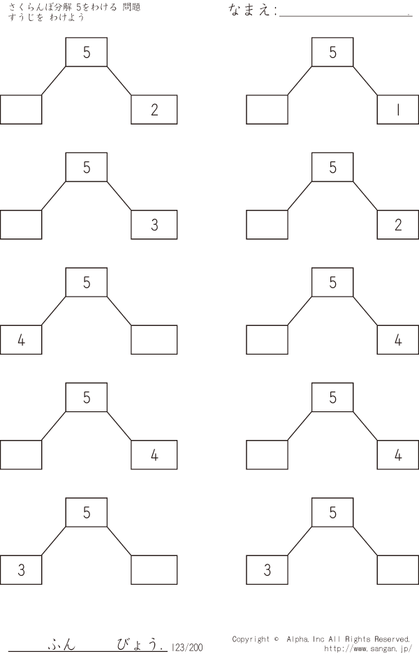 さくらんぼ分解 すうじをわけよう 5をわける [問題]123/200