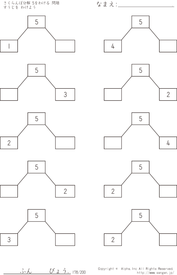さくらんぼ分解 すうじをわけよう 5をわける [問題]178/200