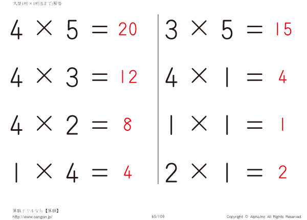 上記のボタンから「大型1桁の掛け算(5まで)」の算数数学ドリル・計算ドリル(PDFプリント)がダウンロードできます。個人利用は無料です(家庭以外での配布は有料です)。
