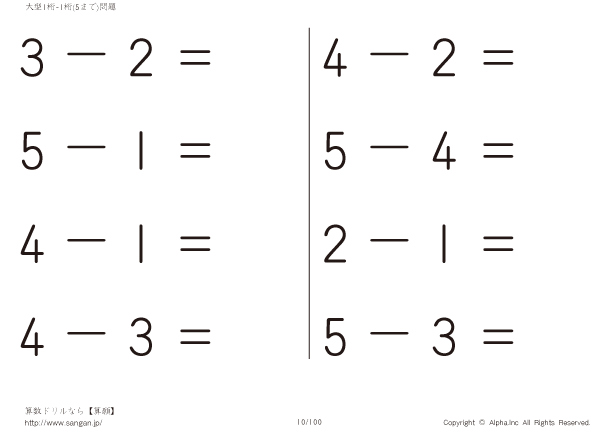 上記のボタンから「大型1桁の引き算(5まで)」の算数数学ドリル・計算ドリル(PDFプリント)がダウンロードできます。個人利用は無料です(家庭以外での配布は有料です)。