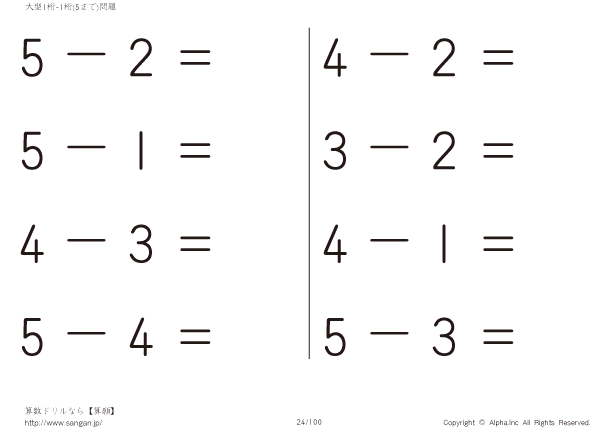 上記のボタンから「大型1桁の引き算(5まで)」の算数数学ドリル・計算ドリル(PDFプリント)がダウンロードできます。個人利用は無料です(家庭以外での配布は有料です)。