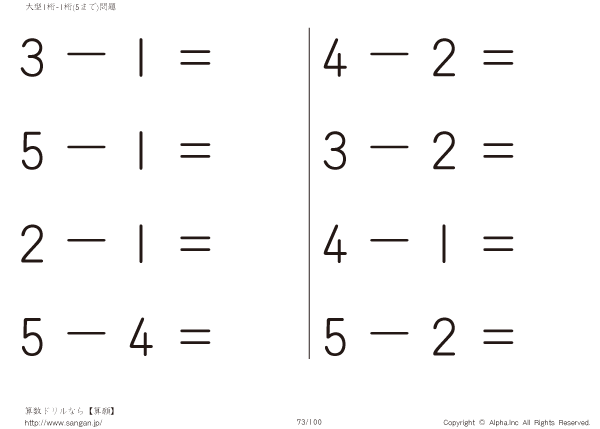 上記のボタンから「大型1桁の引き算(5まで)」の算数数学ドリル・計算ドリル(PDFプリント)がダウンロードできます。個人利用は無料です(家庭以外での配布は有料です)。