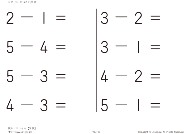 上記のボタンから「大型1桁の引き算(5まで)」の算数数学ドリル・計算ドリル(PDFプリント)がダウンロードできます。個人利用は無料です(家庭以外での配布は有料です)。