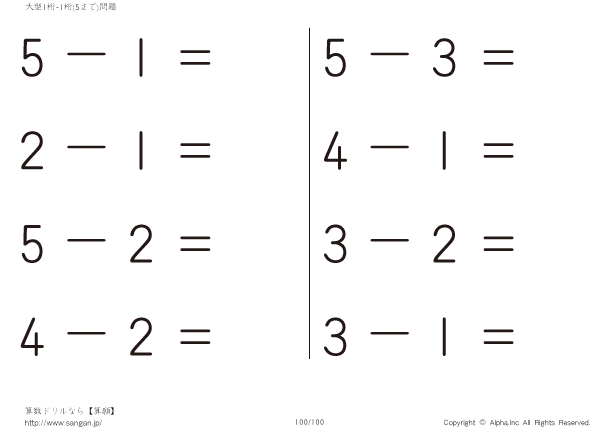 上記のボタンから「大型1桁の引き算(5まで)」の算数数学ドリル・計算ドリル(PDFプリント)がダウンロードできます。個人利用は無料です(家庭以外での配布は有料です)。