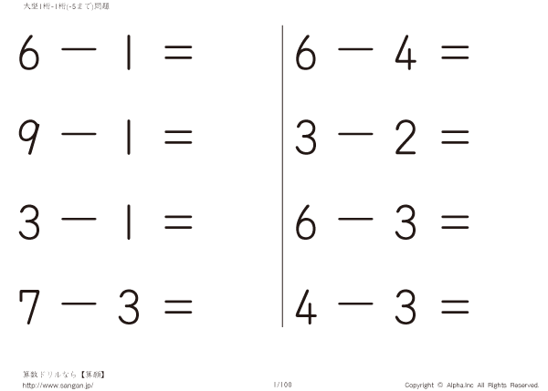 上記のボタンから「大型1桁の引き算(-5まで)」の算数数学ドリル・計算ドリル(PDFプリント)がダウンロードできます。個人利用は無料です(家庭以外での配布は有料です)。