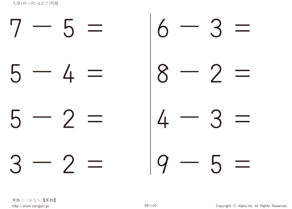 上記のボタンから「大型1桁の引き算(-5まで)」の算数数学ドリル・計算ドリル(PDFプリント)がダウンロードできます。個人利用は無料です(家庭以外での配布は有料です)。
