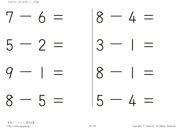 上記のボタンから「大型1桁の引き算(制限なし)」の算数数学ドリル・計算ドリル(PDFプリント)がダウンロードできます。個人利用は無料です(家庭以外での配布は有料です)。