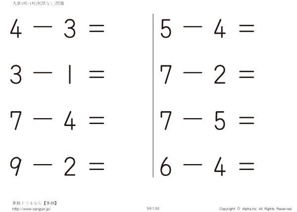 上記のボタンから「大型1桁の引き算(制限なし)」の算数数学ドリル・計算ドリル(PDFプリント)がダウンロードできます。個人利用は無料です(家庭以外での配布は有料です)。
