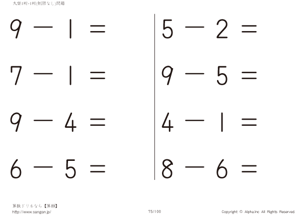 上記のボタンから「大型1桁の引き算(制限なし)」の算数数学ドリル・計算ドリル(PDFプリント)がダウンロードできます。個人利用は無料です(家庭以外での配布は有料です)。