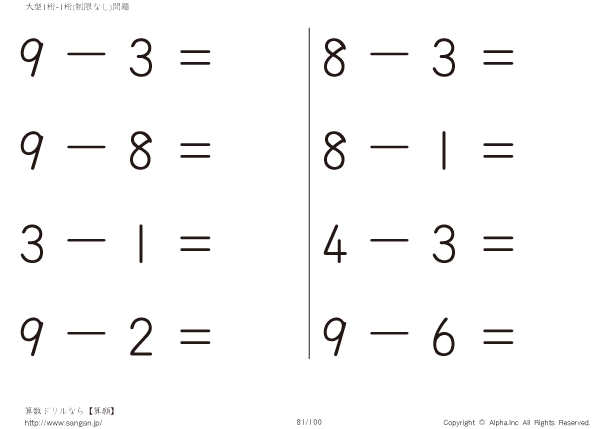 上記のボタンから「大型1桁の引き算(制限なし)」の算数数学ドリル・計算ドリル(PDFプリント)がダウンロードできます。個人利用は無料です(家庭以外での配布は有料です)。