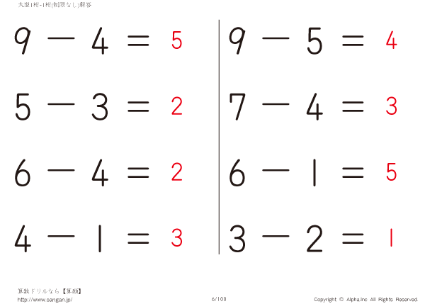 上記のボタンから「大型1桁の引き算(制限なし)」の算数数学ドリル・計算ドリル(PDFプリント)がダウンロードできます。個人利用は無料です(家庭以外での配布は有料です)。