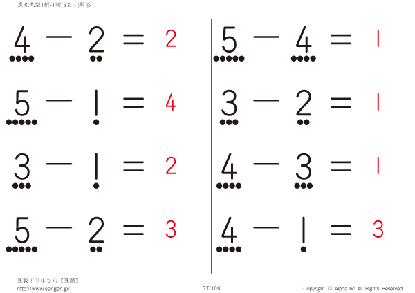 上記のボタンから「黒丸大型1桁の引き算(5まで)」の算数数学ドリル・計算ドリル(PDFプリント)がダウンロードできます。個人利用は無料です(家庭以外での配布は有料です)。