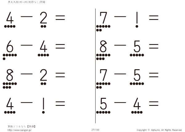 上記のボタンから「黒丸大型1桁の引き算(制限なし)」の算数数学ドリル・計算ドリル(PDFプリント)がダウンロードできます。個人利用は無料です(家庭以外での配布は有料です)。