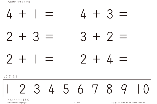 上記のボタンから「大型1桁の足し算(5まで)」の算数数学ドリル・計算ドリル(PDFプリント)がダウンロードできます。個人利用は無料です(家庭以外での配布は有料です)。