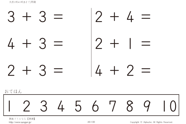 上記のボタンから「大型1桁の足し算(5まで)」の算数数学ドリル・計算ドリル(PDFプリント)がダウンロードできます。個人利用は無料です(家庭以外での配布は有料です)。
