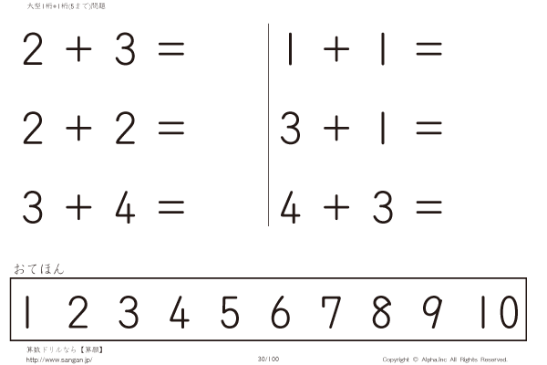 上記のボタンから「大型1桁の足し算(5まで)」の算数数学ドリル・計算ドリル(PDFプリント)がダウンロードできます。個人利用は無料です(家庭以外での配布は有料です)。