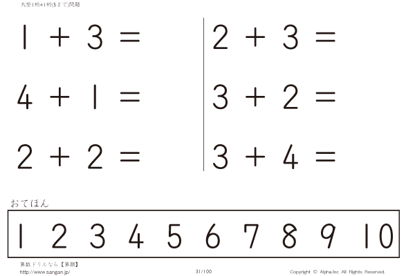 上記のボタンから「大型1桁の足し算(5まで)」の算数数学ドリル・計算ドリル(PDFプリント)がダウンロードできます。個人利用は無料です(家庭以外での配布は有料です)。