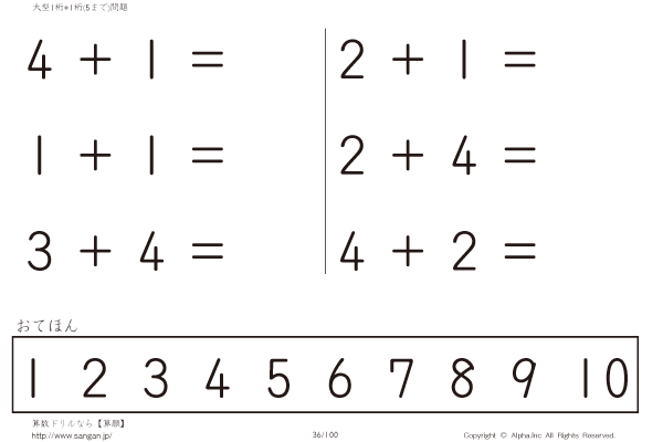 上記のボタンから「大型1桁の足し算(5まで)」の算数数学ドリル・計算ドリル(PDFプリント)がダウンロードできます。個人利用は無料です(家庭以外での配布は有料です)。