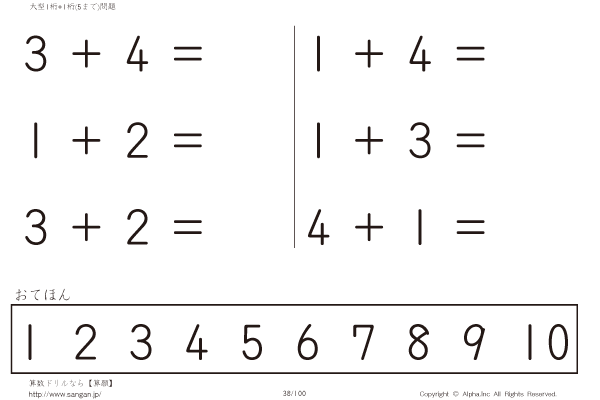 上記のボタンから「大型1桁の足し算(5まで)」の算数数学ドリル・計算ドリル(PDFプリント)がダウンロードできます。個人利用は無料です(家庭以外での配布は有料です)。