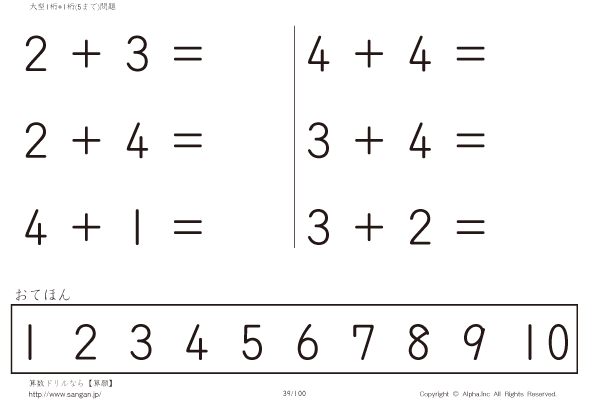 上記のボタンから「大型1桁の足し算(5まで)」の算数数学ドリル・計算ドリル(PDFプリント)がダウンロードできます。個人利用は無料です(家庭以外での配布は有料です)。