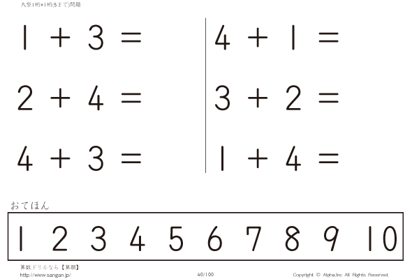 上記のボタンから「大型1桁の足し算(5まで)」の算数数学ドリル・計算ドリル(PDFプリント)がダウンロードできます。個人利用は無料です(家庭以外での配布は有料です)。