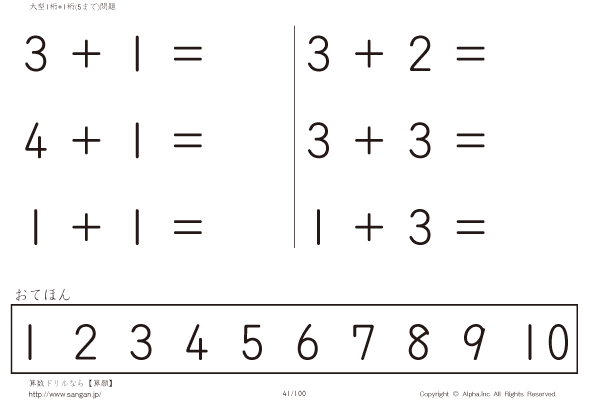 上記のボタンから「大型1桁の足し算(5まで)」の算数数学ドリル・計算ドリル(PDFプリント)がダウンロードできます。個人利用は無料です(家庭以外での配布は有料です)。