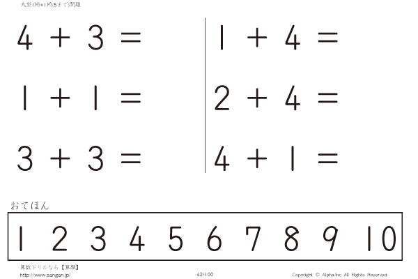 上記のボタンから「大型1桁の足し算(5まで)」の算数数学ドリル・計算ドリル(PDFプリント)がダウンロードできます。個人利用は無料です(家庭以外での配布は有料です)。
