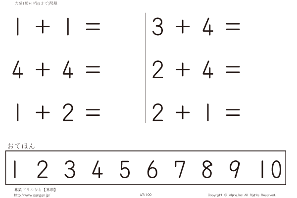 上記のボタンから「大型1桁の足し算(5まで)」の算数数学ドリル・計算ドリル(PDFプリント)がダウンロードできます。個人利用は無料です(家庭以外での配布は有料です)。
