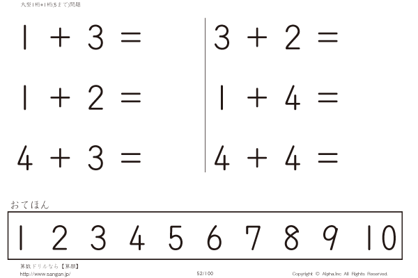 上記のボタンから「大型1桁の足し算(5まで)」の算数数学ドリル・計算ドリル(PDFプリント)がダウンロードできます。個人利用は無料です(家庭以外での配布は有料です)。