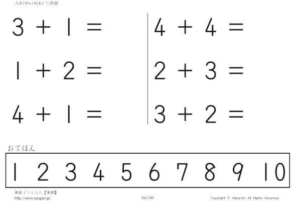 上記のボタンから「大型1桁の足し算(5まで)」の算数数学ドリル・計算ドリル(PDFプリント)がダウンロードできます。個人利用は無料です(家庭以外での配布は有料です)。