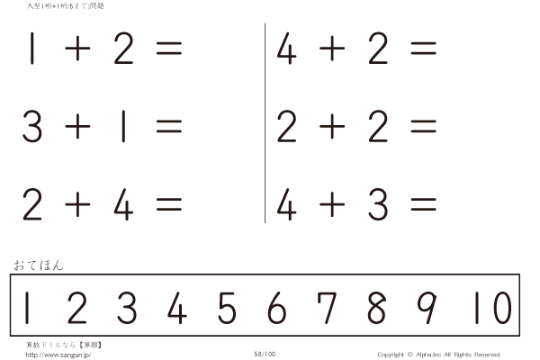 上記のボタンから「大型1桁の足し算(5まで)」の算数数学ドリル・計算ドリル(PDFプリント)がダウンロードできます。個人利用は無料です(家庭以外での配布は有料です)。