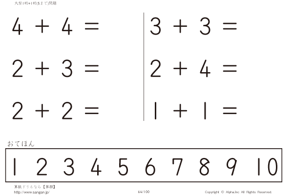 上記のボタンから「大型1桁の足し算(5まで)」の算数数学ドリル・計算ドリル(PDFプリント)がダウンロードできます。個人利用は無料です(家庭以外での配布は有料です)。