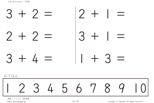 上記のボタンから「大型1桁の足し算(5まで)」の算数数学ドリル・計算ドリル(PDFプリント)がダウンロードできます。個人利用は無料です(家庭以外での配布は有料です)。