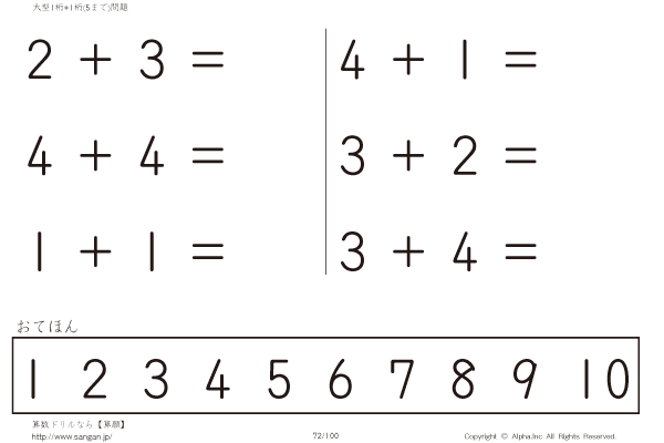 上記のボタンから「大型1桁の足し算(5まで)」の算数数学ドリル・計算ドリル(PDFプリント)がダウンロードできます。個人利用は無料です(家庭以外での配布は有料です)。