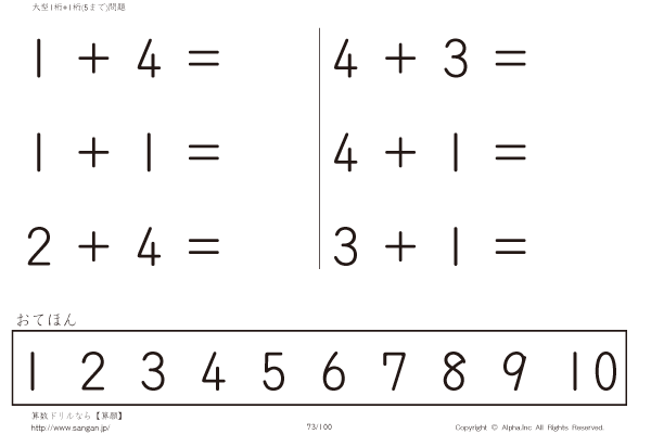 上記のボタンから「大型1桁の足し算(5まで)」の算数数学ドリル・計算ドリル(PDFプリント)がダウンロードできます。個人利用は無料です(家庭以外での配布は有料です)。