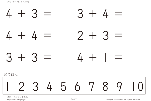 上記のボタンから「大型1桁の足し算(5まで)」の算数数学ドリル・計算ドリル(PDFプリント)がダウンロードできます。個人利用は無料です(家庭以外での配布は有料です)。