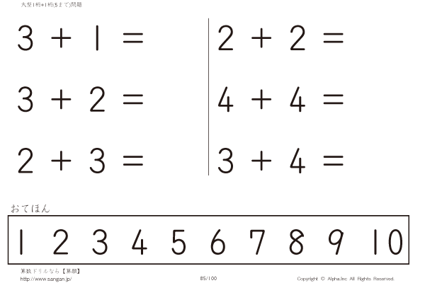 上記のボタンから「大型1桁の足し算(5まで)」の算数数学ドリル・計算ドリル(PDFプリント)がダウンロードできます。個人利用は無料です(家庭以外での配布は有料です)。