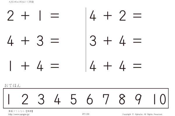 上記のボタンから「大型1桁の足し算(5まで)」の算数数学ドリル・計算ドリル(PDFプリント)がダウンロードできます。個人利用は無料です(家庭以外での配布は有料です)。
