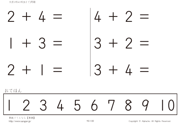 上記のボタンから「大型1桁の足し算(5まで)」の算数数学ドリル・計算ドリル(PDFプリント)がダウンロードできます。個人利用は無料です(家庭以外での配布は有料です)。