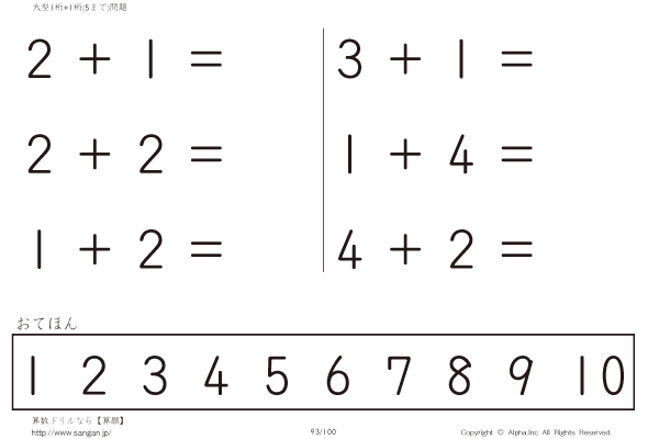 上記のボタンから「大型1桁の足し算(5まで)」の算数数学ドリル・計算ドリル(PDFプリント)がダウンロードできます。個人利用は無料です(家庭以外での配布は有料です)。