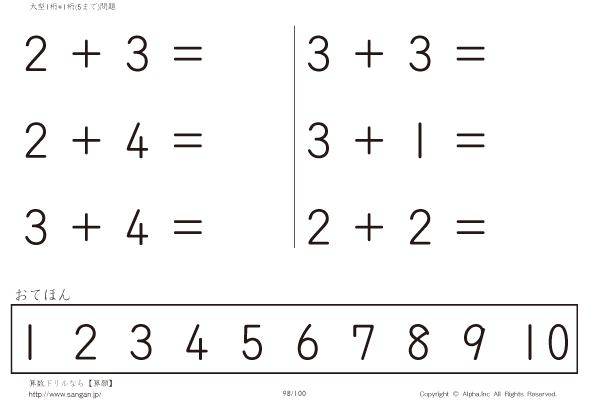 上記のボタンから「大型1桁の足し算(5まで)」の算数数学ドリル・計算ドリル(PDFプリント)がダウンロードできます。個人利用は無料です(家庭以外での配布は有料です)。