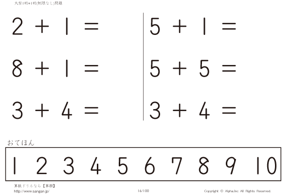 上記のボタンから「大型1桁の足し算(制限なし)」の算数数学ドリル・計算ドリル(PDFプリント)がダウンロードできます。個人利用は無料です(家庭以外での配布は有料です)。