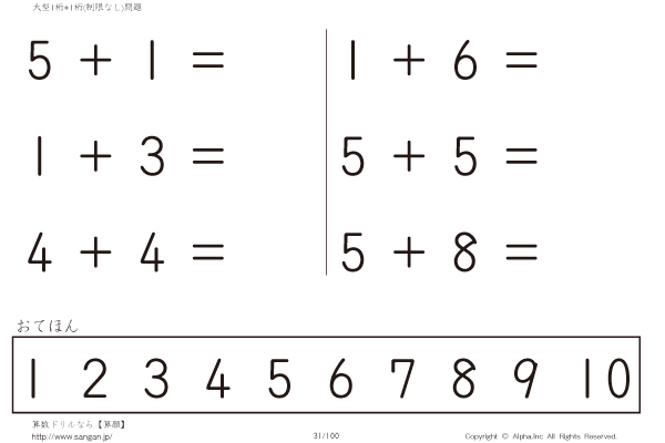 上記のボタンから「大型1桁の足し算(制限なし)」の算数数学ドリル・計算ドリル(PDFプリント)がダウンロードできます。個人利用は無料です(家庭以外での配布は有料です)。