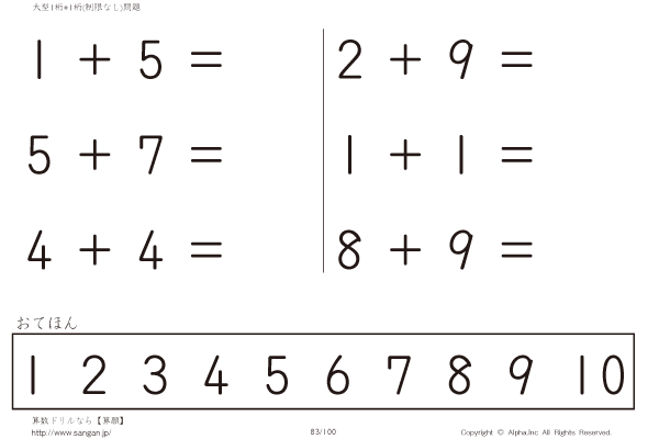 上記のボタンから「大型1桁の足し算(制限なし)」の算数数学ドリル・計算ドリル(PDFプリント)がダウンロードできます。個人利用は無料です(家庭以外での配布は有料です)。