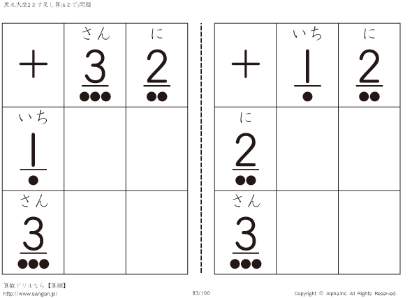 上記のボタンから「大型2ます+2ます(6まで)」の算数数学ドリル・計算ドリル(PDFプリント)がダウンロードできます。個人利用は無料です(家庭以外での配布は有料です)。