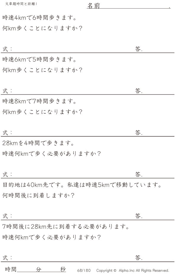 時間と距離の文章題1:時速8kmまで [問題]068/180
